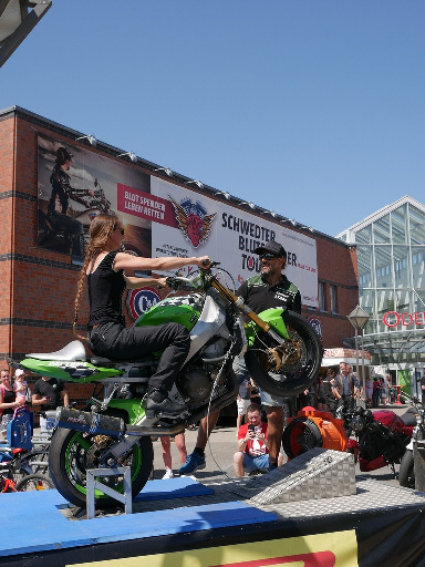 Auf dem Center-Vorplatz spielte währenddessen die Schwedter Band COS, Schüler der Talsand-Schule verkauften Kaffee und Kuchen für ihre Abiball-Kasse und die DWS-Werbeagentur bot die beliebten Tour-Shirts an. Highlights des kleinen Rahmenprogramms waren der Wheelie-Stand, bei dem selbst ungeübte Motorradfahrer „nur auf dem Hinterrad stehen“ konnten, und der Pocketbike-Parcour für die kleinen Gäste.